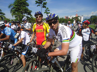 Já estava com saudades de participar de uma competição. Esta foi a primeira do ano. Dessa vez participamos eu e Guilherme ou melhor quase só eu heheeeee. Depois eu explico. A largada estava marcada em frente ao parque das aguas e mais uma vez nos aprontamos com as bikes nos carros e partimos. Reencontramos os amigos, fizemos novas amizades e logo já estavamos preparados para a prova. Numeral na bike e é dado a ordem para alinharmos. Nossa categoria era light, pois era um percurso menor e não queriamos exagerar logo na primeira prova do ano. De inicio a largada foi meio tumultuada, pois depois de 3 km todos se agrupariam e seria dada nova largada. Porem não foi o que aconteceu. A galera da pro disparou e só nós da light nos alinhamos, porem a organização e nós tambem ficamos preocupados pois poderia haver atletas da light infiltrados na pró. De certa forma a organização foi honesta e disse que se tivesse alguem da light na frente este seria desclassificado. se teve ou não eu não sei. Só sei que quando foi dada a largada tratei de contar os bikers que passavam por mim e no final deu tudo certo. A prova estava desgastante pois o sol estava nos proporcionando uma bela temperatura media de 38°C. Fui seguindo minha prova firme sem correria. Tentava sempre manter um ritmo legal e acompanhava ao longe alguns adversarios. Foi assim praticamente toda a prova. Passei pelo ponto de agua onde foi dada uma aguinha quente. Nem desceu garganta abaixo, joguei na cabeça e fui rumo aos quilometros finais. Faltando 4 km comecei a pedalar com mais dois ciclistas e fomos assim até a reta de chegada, onde eu me precipitei e comecei a pedalar forte antes da hora, como eles vinham na minha cola ficou facil acompanhar e na hora que achei que conseguiria manter na frente tinha uns cones faks antes da linha de chegada. Ai os dois conseguiram me passar e só administrei. Acabei chegando em 6º na geral light e 4º na masculino light. Bom demais pois minha intenção era chegar entre os 10 primeiros. Na chegada escutei alguem gritando - "é isso ai Wiliam" achei que fosse outra pessoa, mas quando dei a volta e fui buscar a medalha quem era? O Guilherme! De cara me assustei e pensei furou algum pneu e ele desistiu de trocar, ou até que tinha quebrado alguma coisa na bike. Ele foi então logo me dizendo: Morri! Comecei a passar mal e desisti da prova. Relatou ainda que correu cerca de 7 km e voltou pelo mesmo caminho. Ainda bem que ele sabe dos seus limites e fez o certo. Mas bola pra frente que mais provas vão vir. Tentar fazer um treinamento mais certo para evitar estes tipos de contratempos. Provinha show de bola, bem rapida. A galera esta treinando maneiro e esta ficando cada vez mais dificil de acompanhar. Mas o importante é participar. Agradeço ao apoio que mais uma vez comeu mosca e não estava na linha de chegada para nós prestigiar mas que de qualquer forma é importante para estar nos apoiando. Valeu galera e esta então aberta oficialmente a temporada 2012 de provas da equipe OFF ROAD BIKERS.